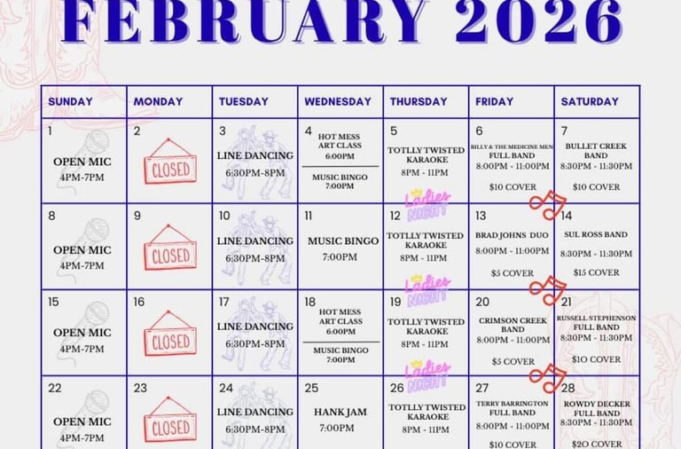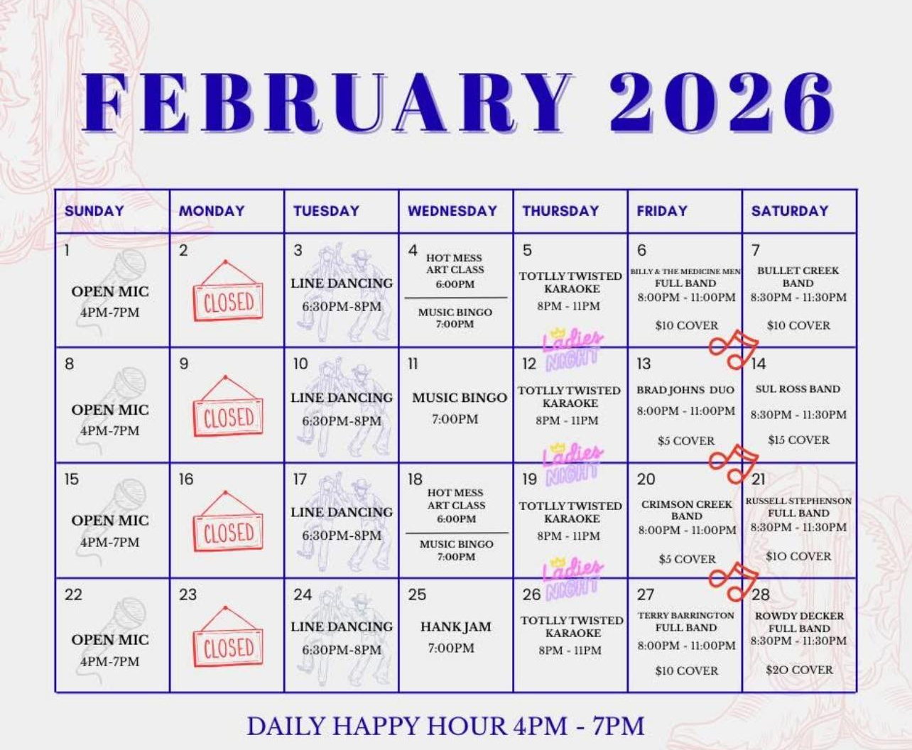 During the week, there is always something happening. Join us for free line dance lessons every Tuesday, then come back Thursday for Ladies Night. Or register for the weekly pool tournament every Friday. Our big Hank Jam event kicks off on February 25th and will run for eight weeks, taking place every Wednesday. Plus we've got stacked Sundays with Music Bingo at 2pm, Open Mic at 4pm, and Karaoke (biweekly) at 7pm.